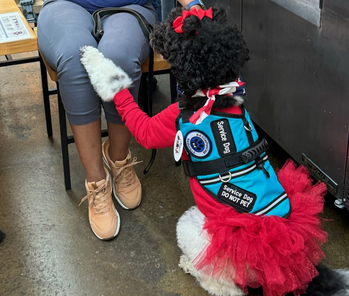 The dog must prove to be good in public. It must not be aggressive to dogs or humans, must stay by the owners side without being a nuisance, and must follow commands without need of forceful correction. The dog should be able to navigate through crowds of people, in and out of doorways, and calmly lay down next to or under a table as appropriate.