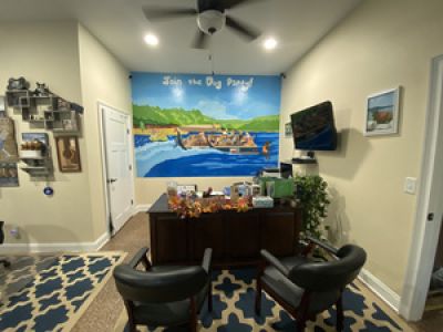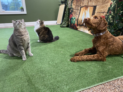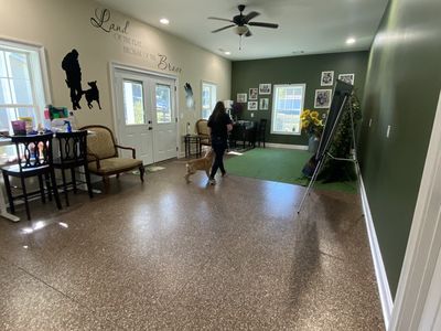 Dogs listen to country music all day and meditation music at night. Essential oils such as frankincense and lavender waft through the air for calming.